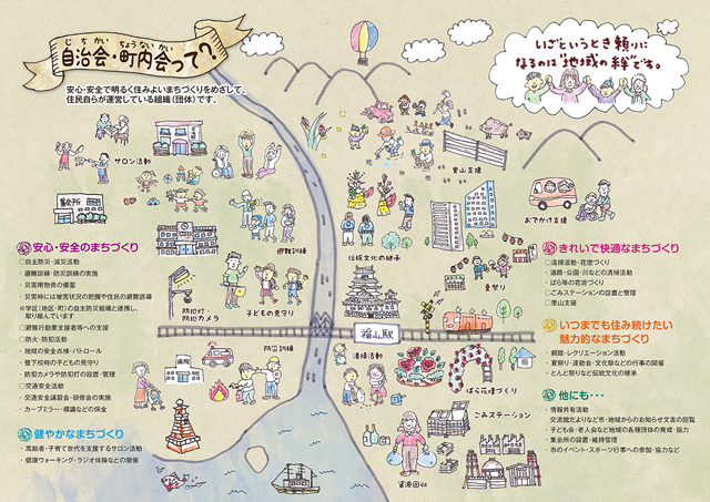 自治会(町内会)は地域生活の中で、住民相互のコミュニケーションのもとで全員参加での活動ができ、また地域子ども会等の他の団体においても独自の活動ができ、コミュニティ活動がより図られることが大切です。